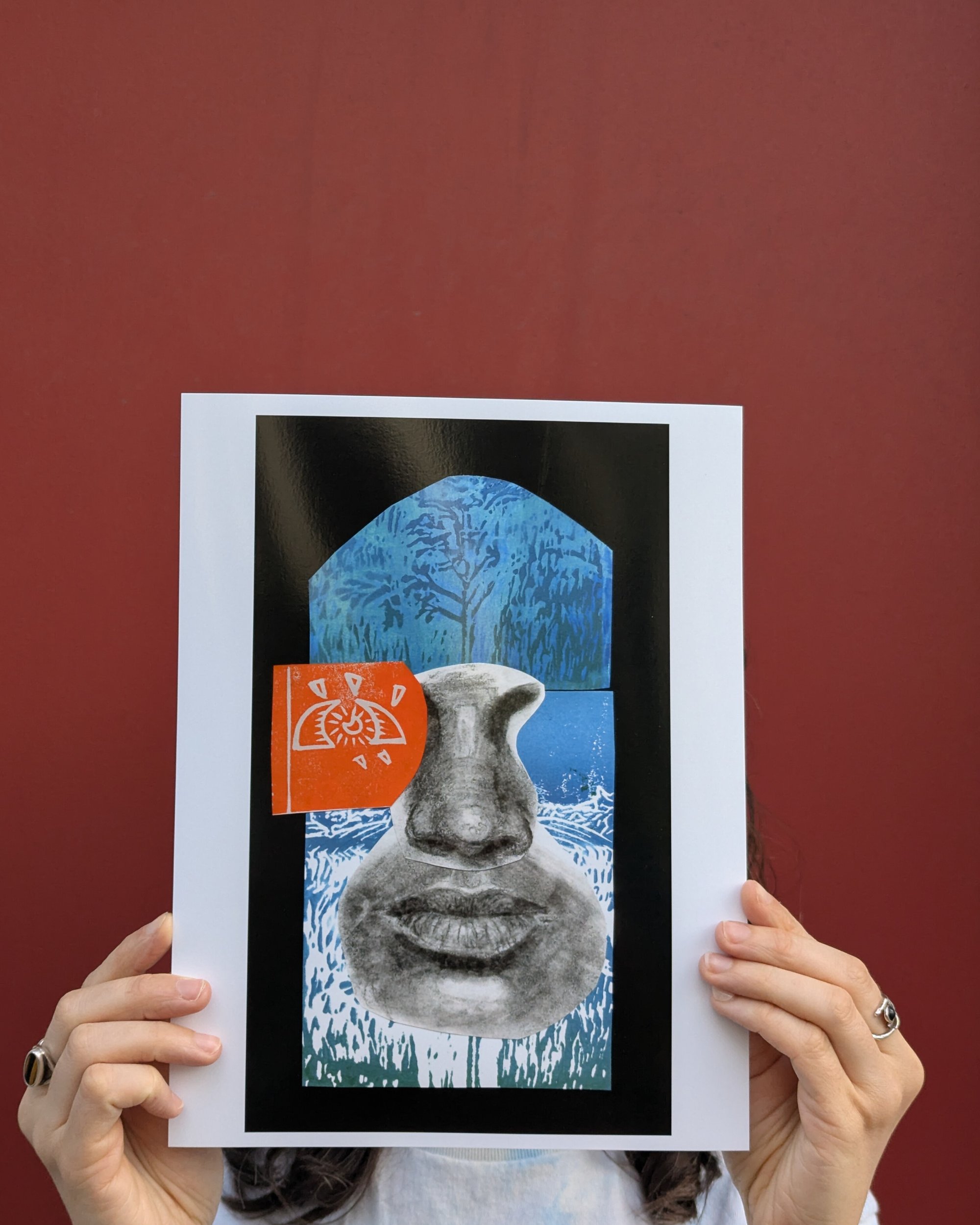 (Original work: Block print, charcoal collage on paper)